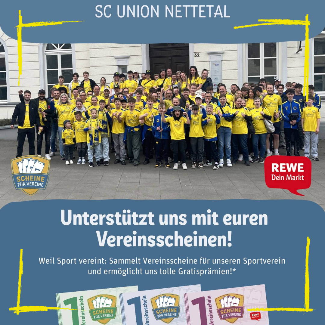 Gemeinsam für die SC Union Nettetal Jugendabteilung. Unterstützt uns bei der Aktion „Scheine für Vereine“. In jedem beliebigen Rewe Markt erhaltet ihr vom 19.05 - 22.06.2025