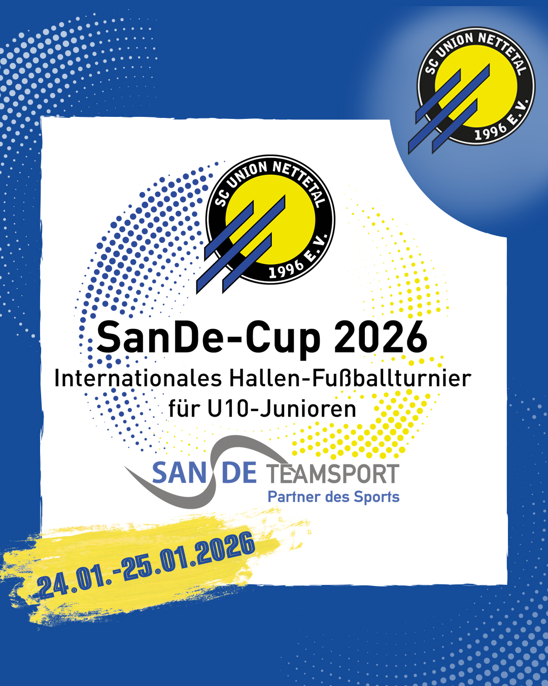 Bereits zum 19. Mal richtet der SC Union Nettetal vom 24.01.-25.01.2025, das weit über die Stadtgrenzen bekannte U10-Juniorenturnier den "internationalen SanDe-Cup" in der Werner-Jaeger-Sporthalle in Nettetal aus.